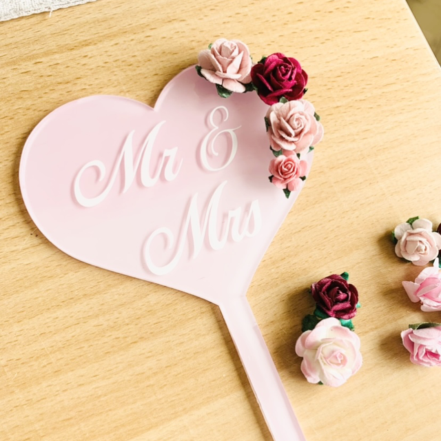 Mr & Mrs Heart Acrylic Cake Topper Pink