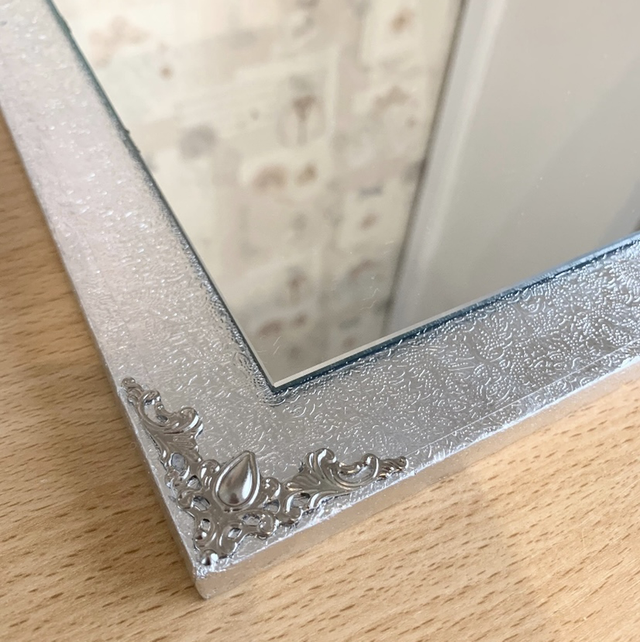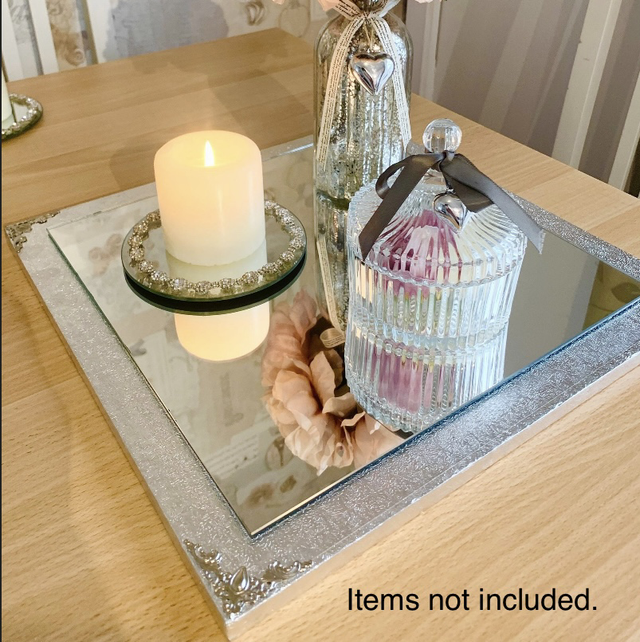 Ornate mirror tray for accessories, candles, decorative pieces.