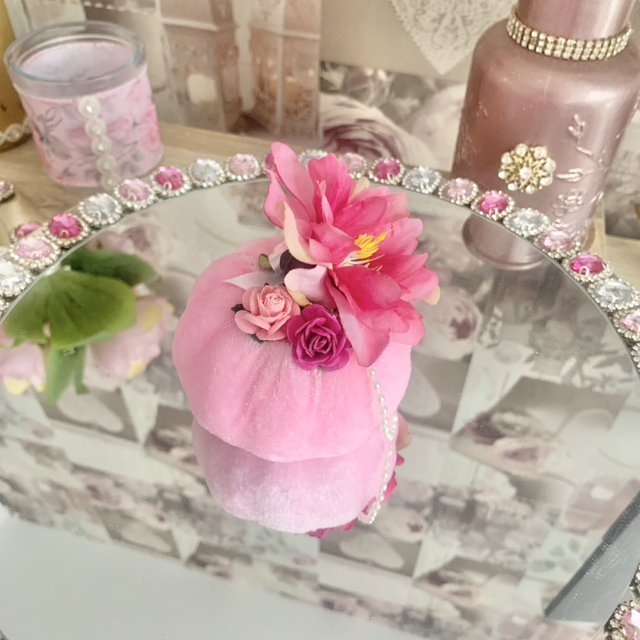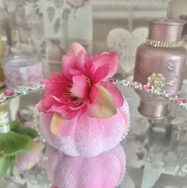 Handmade pink velvet pumpkin - add this ornament to your seasonal decor or as a gift for a loved one!